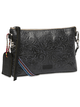 - Includes two detachable straps: a leather shoulder strap and an adjustable woven crossbody strap