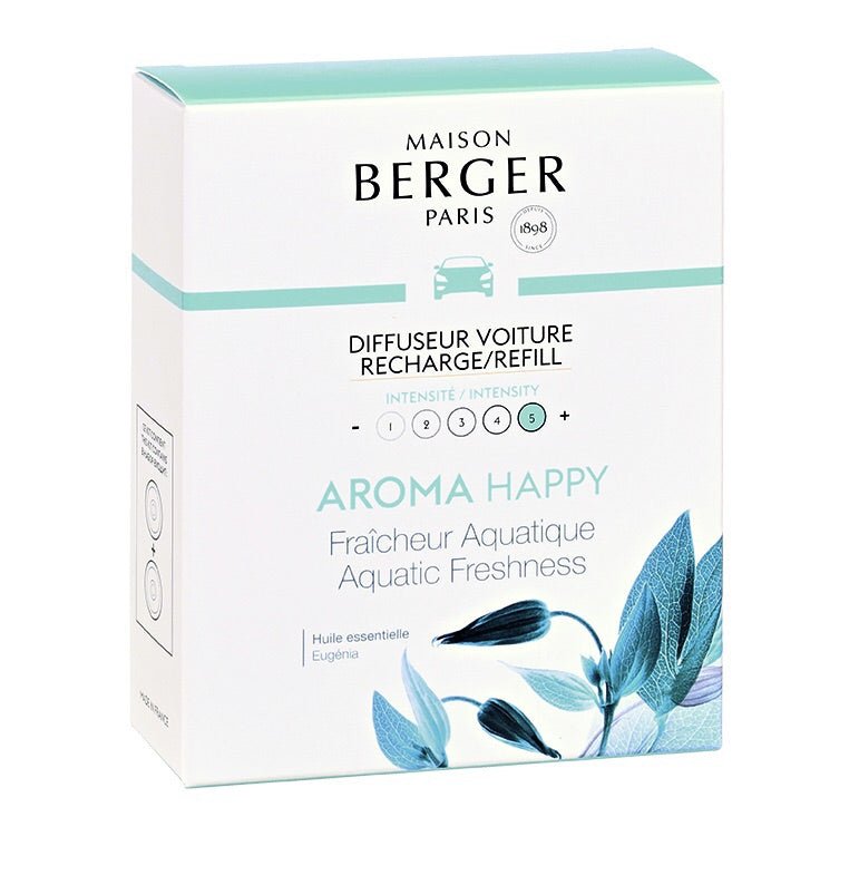 This box contains 2 Maison Berger Aroma Happy Car Diffuser fragrance refills. The Aquatic Freshness scent features notes of apple, melon and amber. It also contains eugenol essential oil to create peace of mind and release blocked energy. If you enjoy this new Lampe Berger scent at home you can now enjoy it on the go as well.