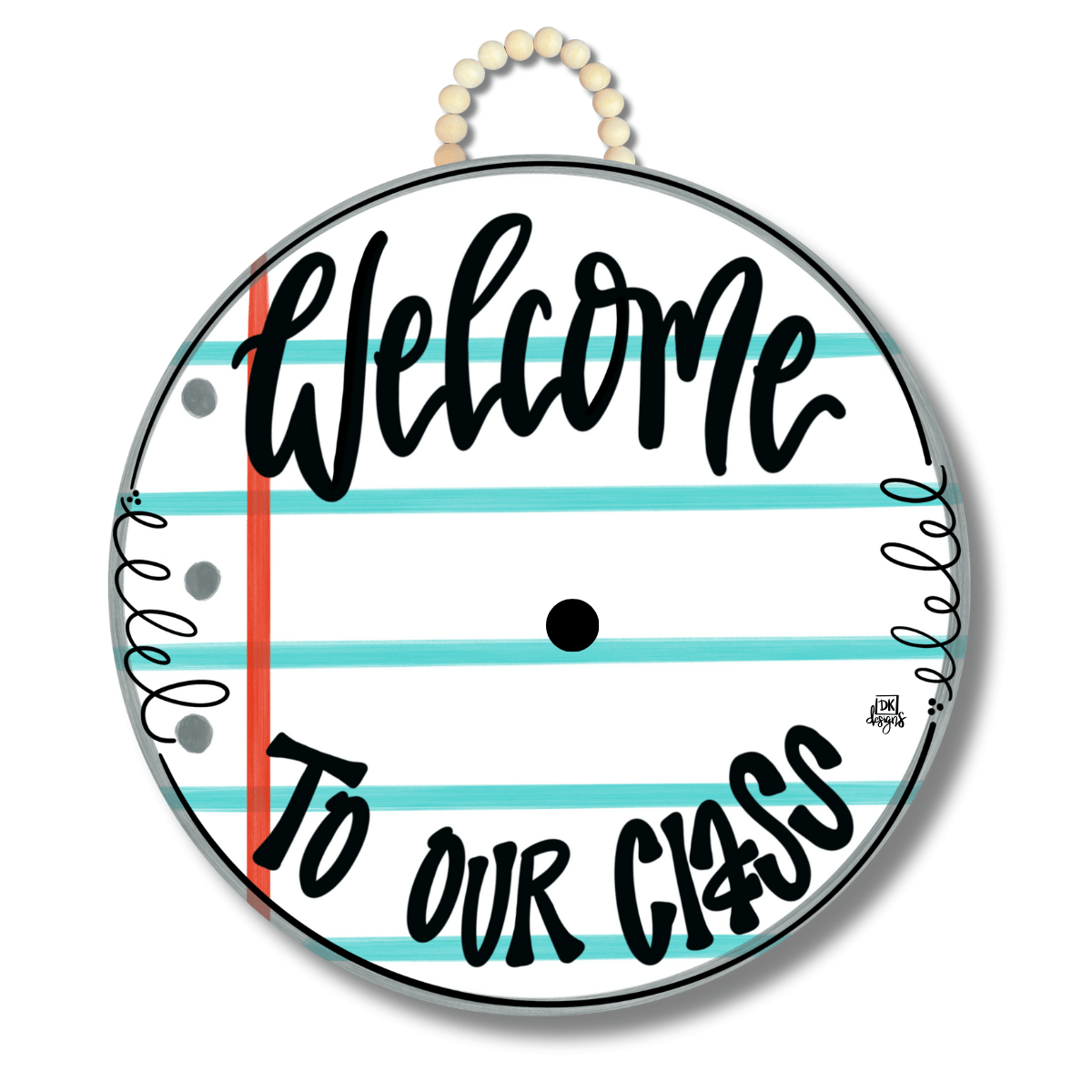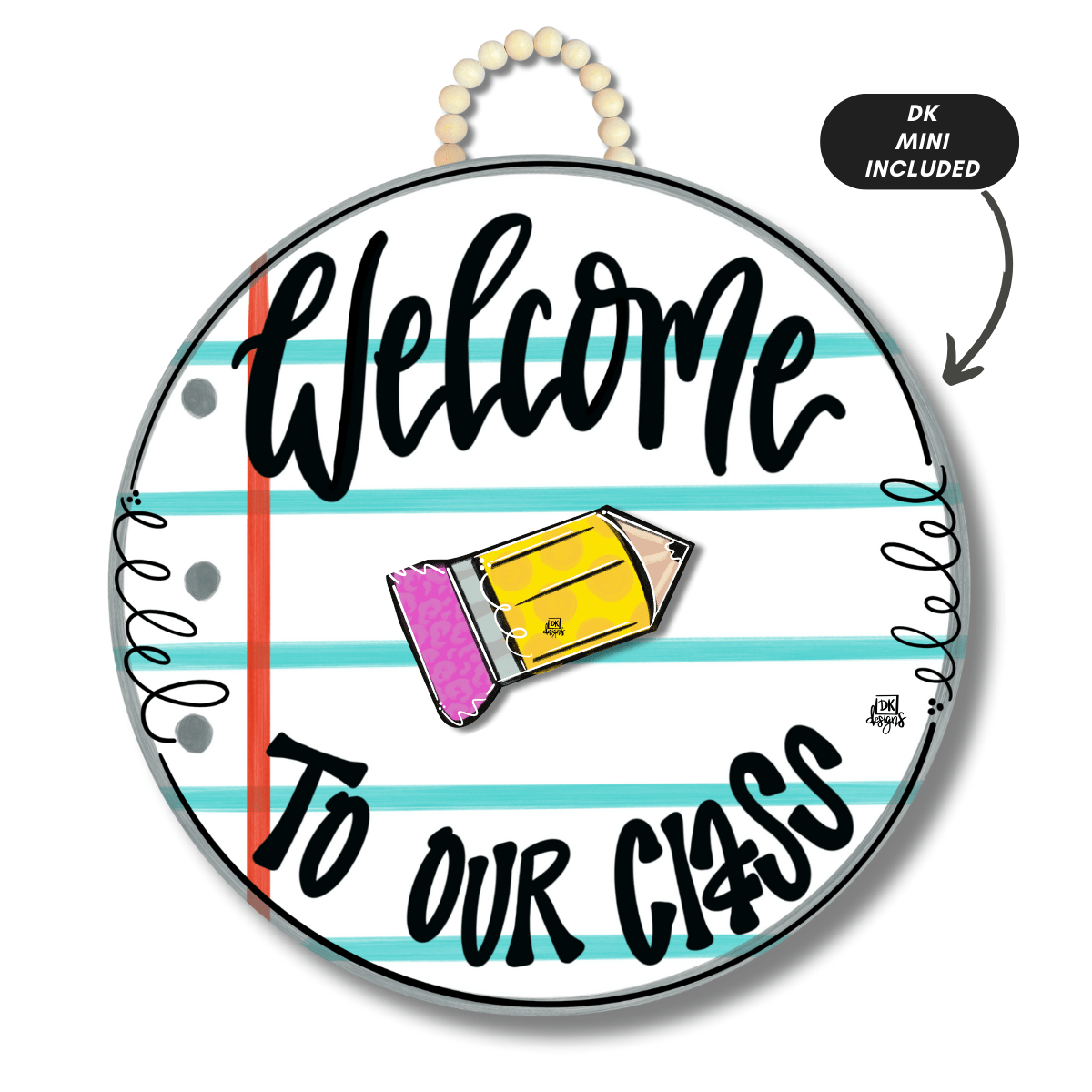 The Welcome to Our Class Bright Door Hanger is a UV Printed Door hanger measuring 23" tall that is perfect for indoor or outdoor use. All original designs are printed on a moisture resistant high quality 1/4" board and sealed for additional protection with 2 coats of a gloss finish. DK hangers come with a fully wired beaded handle. All products are designed, and manufactured in Forsyth, Georgia.
