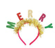 Add a touch of festive flair to any celebration with this Cheer Tinsel Headband. Crafted from soft felt, this headband is designed for comfort and style. The standout feature is its vibrant tinsel crown, which adds a sparkling touch to your look. Adorned with intricately cut glitter icons and cheerful sentiments, this headband is perfect for parties, holidays, or any occasion that calls for a little extra cheer. With an outer width of 1/2" and a topper height of approximately 2 1/2", it offers a secure fit while making a bold statement. Ideal for both adults and children, this headband is a must-have accessory for spreading joy and festive spirit.