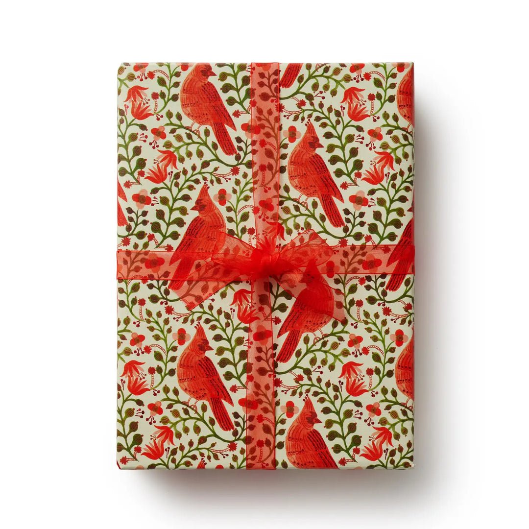 Dress up your presents with this printed wrapping paper, featuring 8 feet of elegant cardinal illustrations, red glitter foil, and gridlines on the back.
