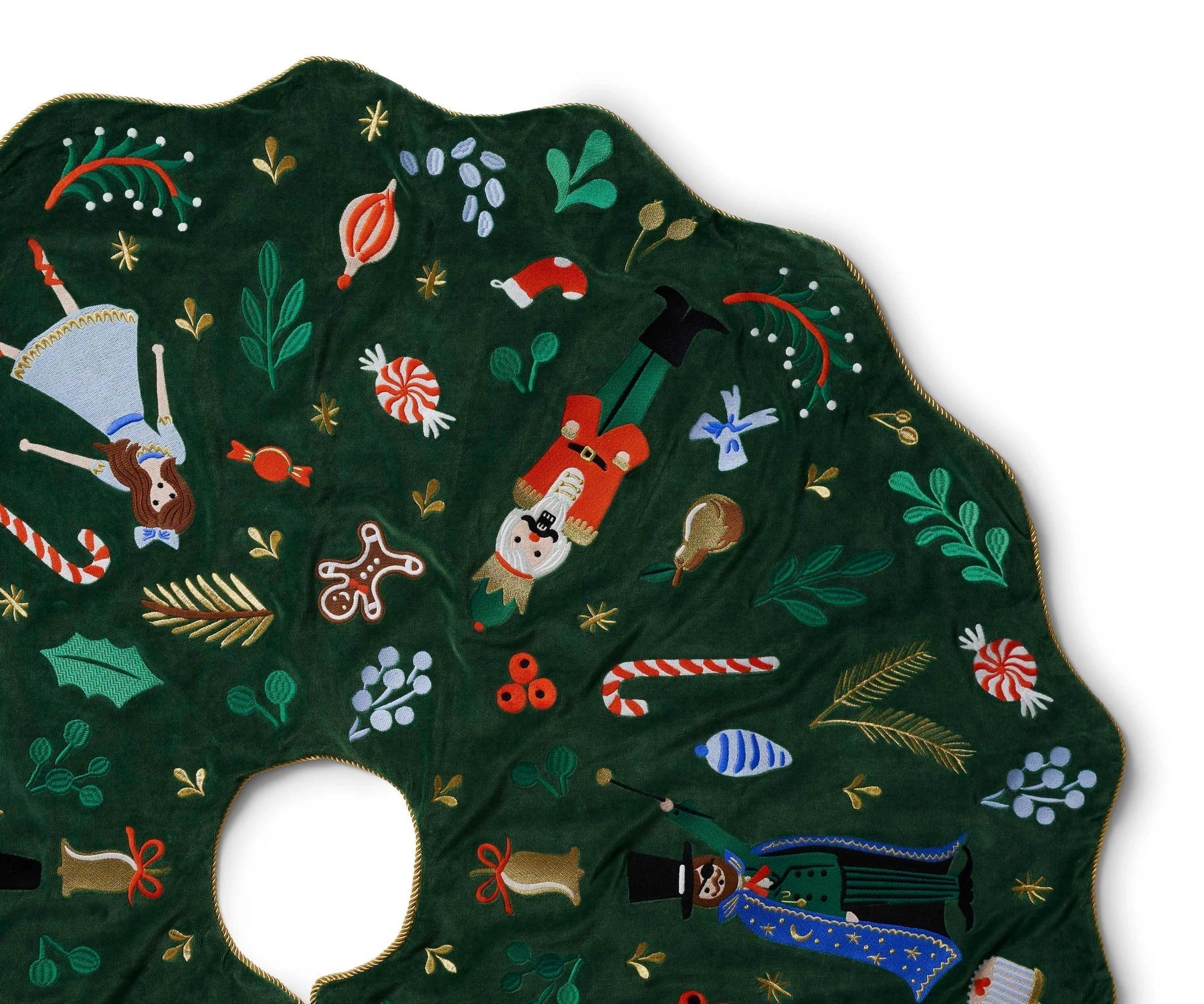 Our luxe green velvet tree skirt is embroidered with our favorite characters from the Nutcracker ballet, and finished with a scalloped edge.