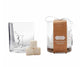 Double old fashioned deer whiskey glass with raised in-mold deer side icon arrives with three soapstone cubes for drink chilling in drawstring bag.