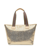 - Natural leather handles and multicolored, woven, adjustable crossbody strap