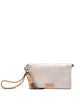 - Includes two detachable straps: a leather shoulder strap and an adjustable woven crossbody strap