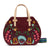 - Iconic floral embroidery on shimmery wine colored woven exterior