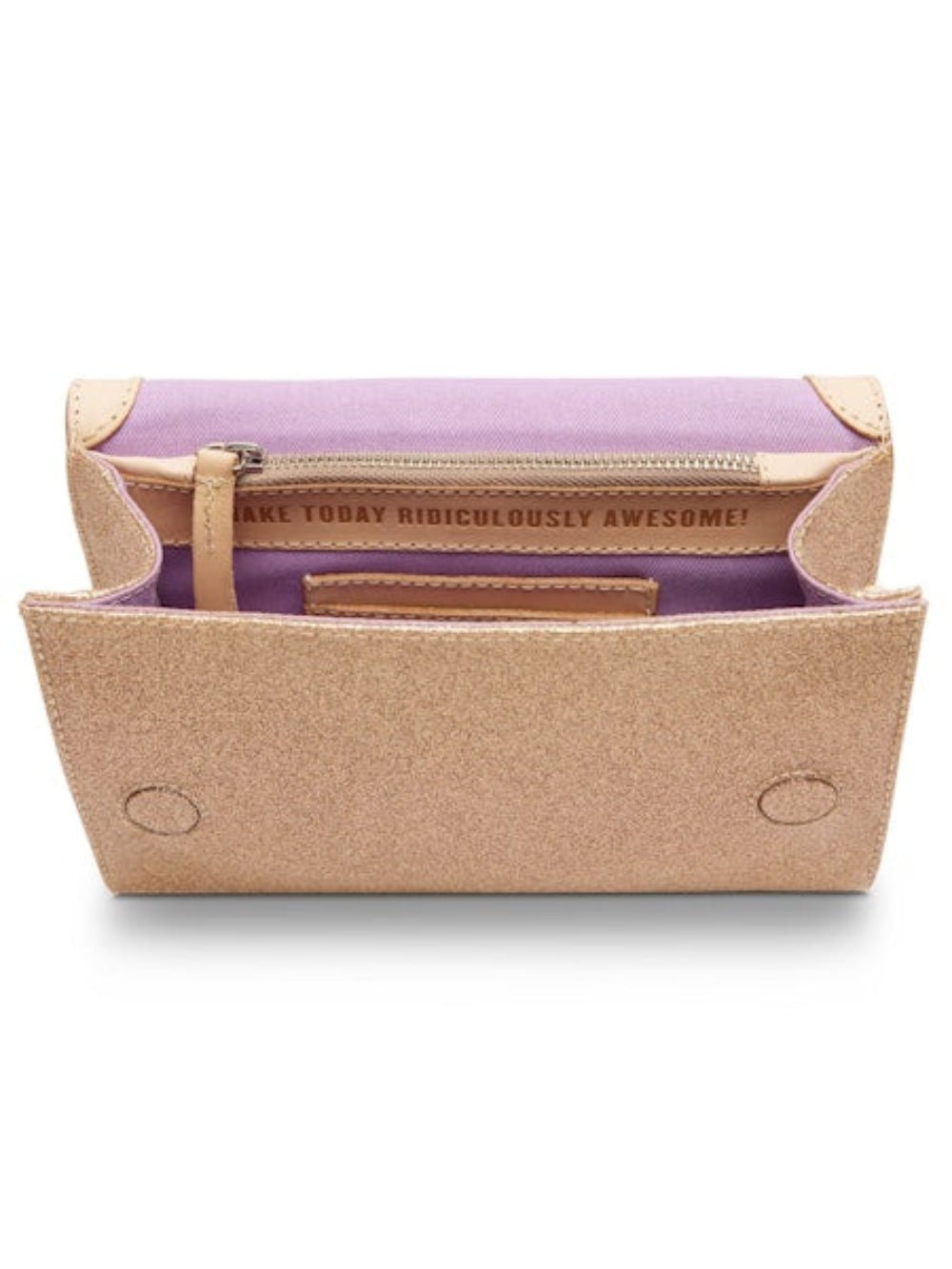 - Signature animal print embroidery on a gold glitter exterior