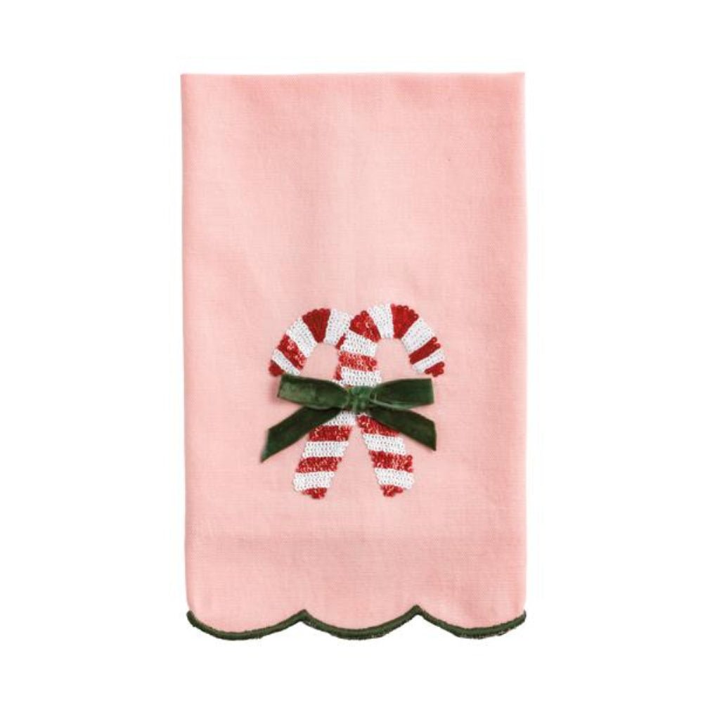 The Candy Cane Sequin Towel is a delightful addition to your holiday decor, combining festive charm with practical functionality. Crafted from 100% cotton, this hand towel offers a soft and absorbent texture, perfect for everyday use or special occasions. Measuring 21" x 14", it provides ample coverage and versatility for various tasks. The towel is adorned with intricate sequin appliqués, adding a touch of sparkle and elegance to your bathroom or kitchen. The satin-stitched serged scallop edge enhances its durability while providing a sophisticated finish. Ideal for gifting or personal use, this towel brings a festive spirit to any setting.