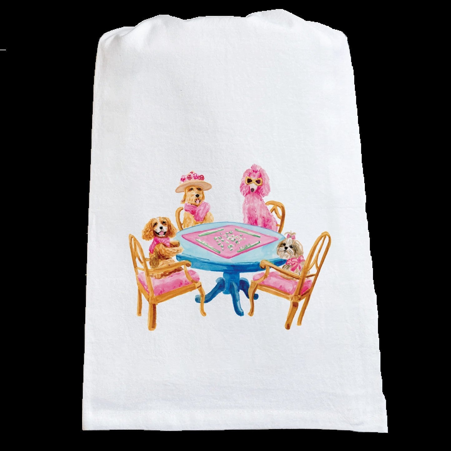 Add whimsical charm to your kitchen with this delightful 27" x 27" flour sack tea towel featuring an adorable dogs playing mahjong design.