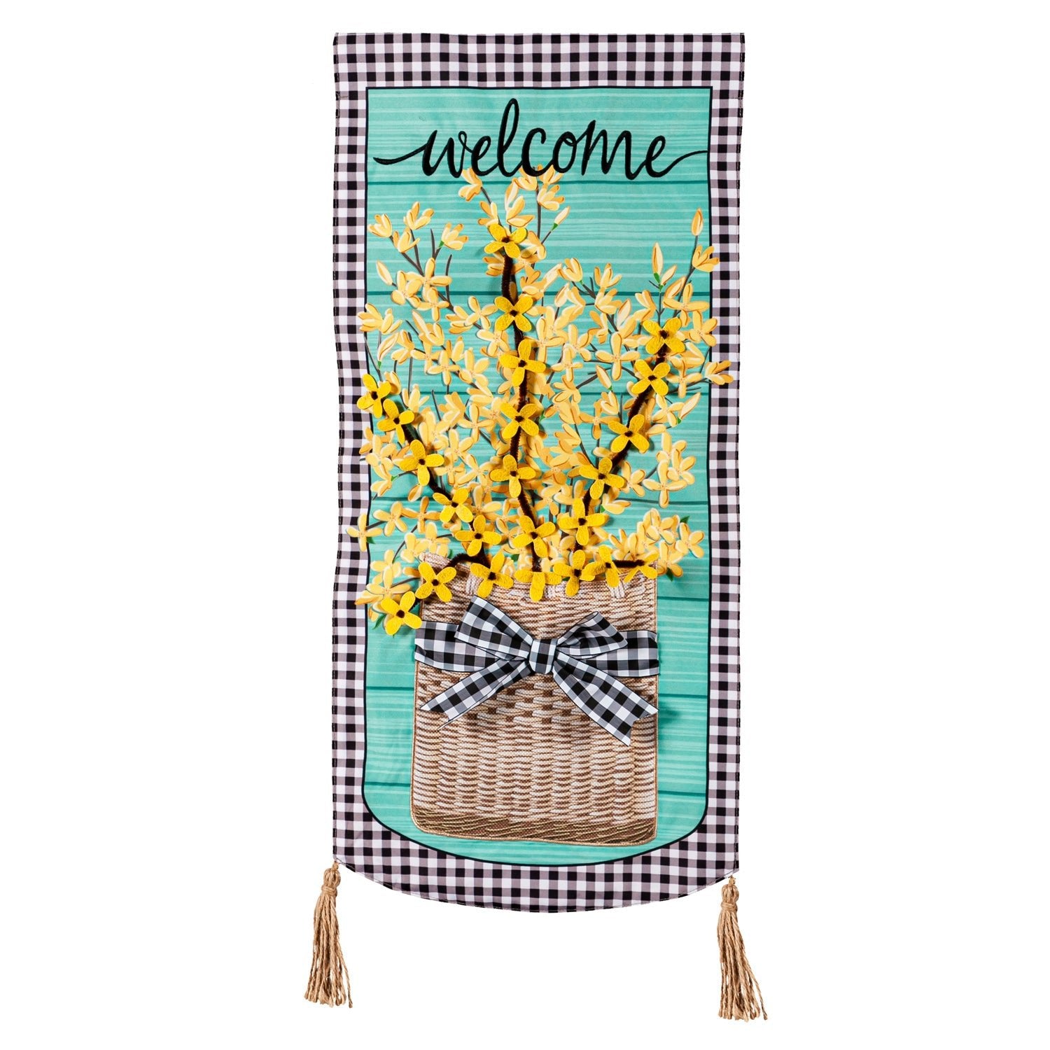 Our Forsythia Basket Everlasting Impressions Textile D?r is perfect for refreshing your outdoor space with seasonal colors and a floral greeting. "Welcome" is elegantly printed above a basket full of forsythia blooms on a beautiful blue wood plank background for a vibrant statement. Black and white buffalo check borders match the embellished bow for a complimentary design you can leave up all season long. Part of our Perfect Pennant collection, these versatile designs are crafted from a blend of poly-linen that ensures they are indoor and outdoor safe. The stunning collection is ideal for holiday decorating or welcoming everyday guests. Exclusive artwork created by our in-house creative team brings the pennants to life. Perfect for any space, these pieces can be hung on a door or used with a garden flag stand or dowel. Inspired by statement porch leaners, our double-sided pennants feature a variety of sweet sayings and phrases and are readable from both sides of the banner.