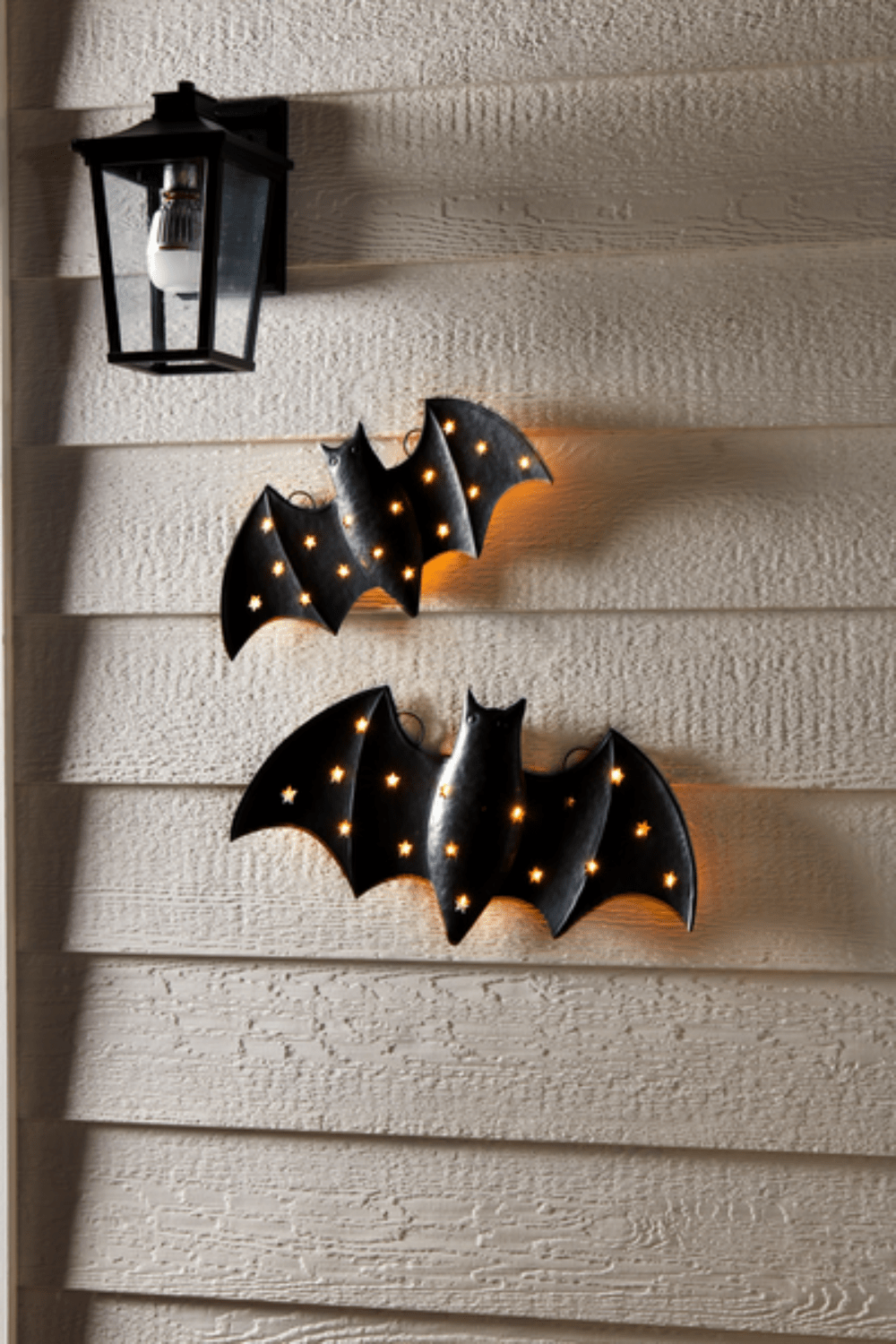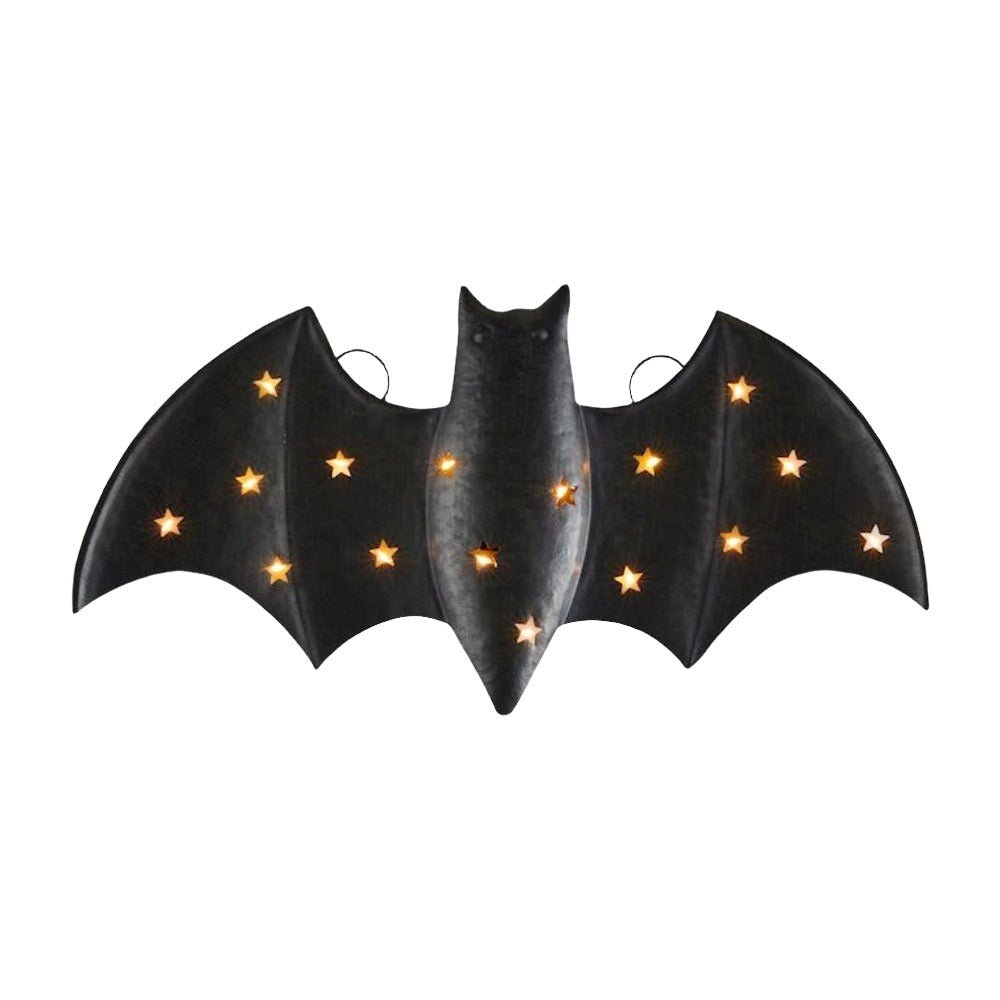 The Small Light-Up Bat Decor is a unique and eye-catching piece that is perfect for adding a touch of spooky charm to your home decor. This hand-painted tin bat features a cut-out star detail that is illuminated by LED lights, creating a mesmerizing glow that is sure to impress. Measuring 7 3/4" x 16", this bat decor is the perfect size to display on a shelf, mantel, or table. Please note that this item requires 2 AAA batteries, which are not included. With its intricate design and high-quality construction, this Small Light-Up Bat Decor is sure to become a favorite Halloween decoration for years to come.