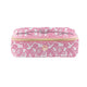 Introducing the Let's Face It Bag—a stylish and functional companion for all your makeup and toiletry needs! With a sleek solid exterior and a vibrant printed interior, this bag keeps your essentials organized and easily accessible. The gold metal hardware adds a touch of elegance, making it a perfect addition to your beauty collection.