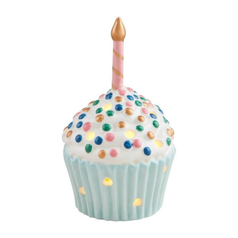 Cupcake Light-Up Sitter. This charming hand-painted ceramic sitter is designed to bring a touch of whimsy and warmth to any space. Featuring intricate cut-out details, it allows the LED light to shine through, creating a delightful ambiance. The included battery ensures that it's ready to illuminate your home right out of the box. Measuring 4 1/4" x 2 3/4", this delightful piece is crafted from high-quality dolomite, offering both durability and a smooth finish. Perfect for adding a playful yet elegant touch to your decor, this light-up sitter is ideal for any room or occasion.