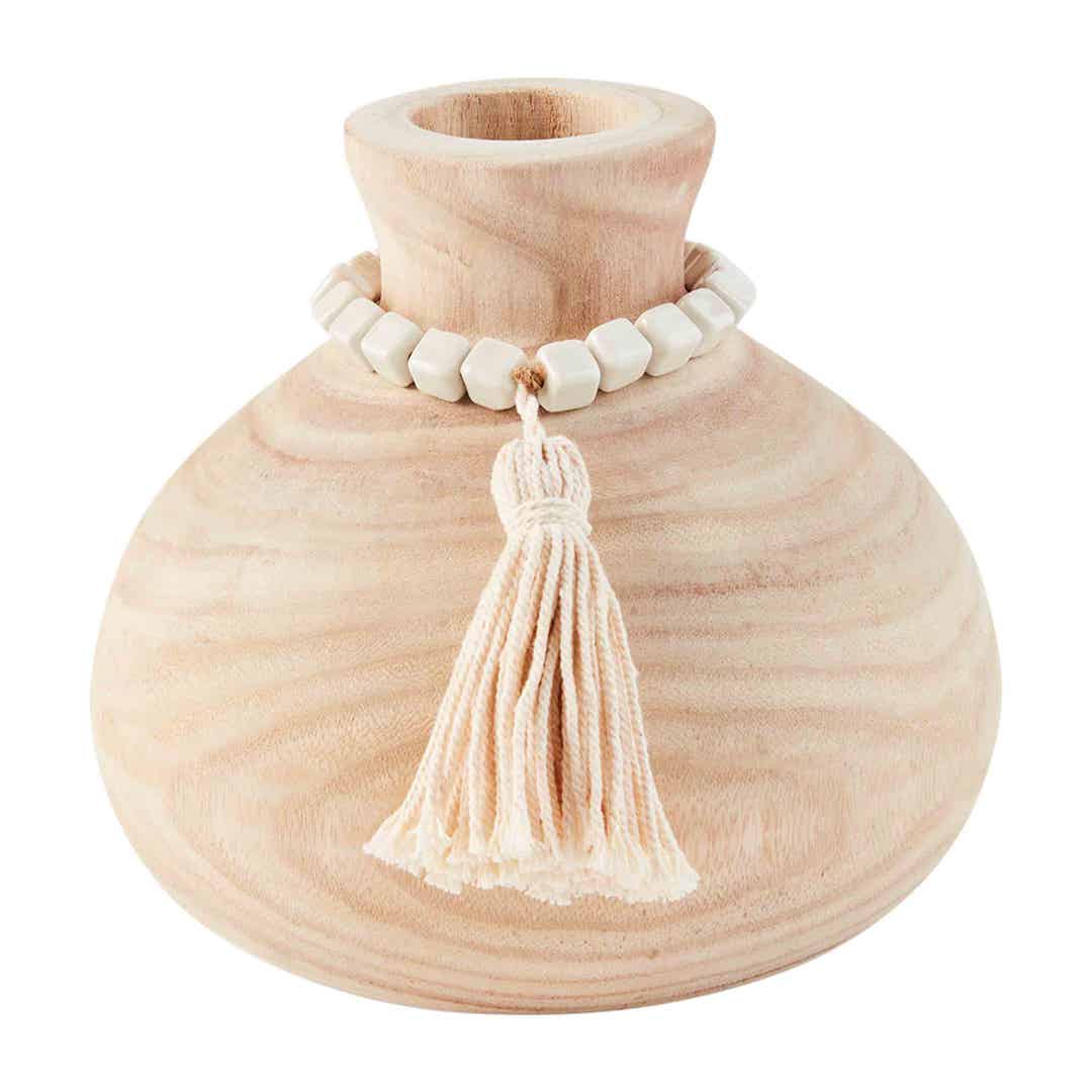 Our Natural Wood Vase is perfect for a neutral color palette. The vase is made of paulownia wood. The vase features draped ceramic beads. The ceramic beads feature a tassel ending. This vase is intended for decorative purposes. We love pairing this vase with pampas grass.
