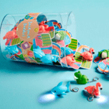 Lights and sounds animal keychain. Batteries included. Comes on display card in acrylic display bucket. Ages 3+.