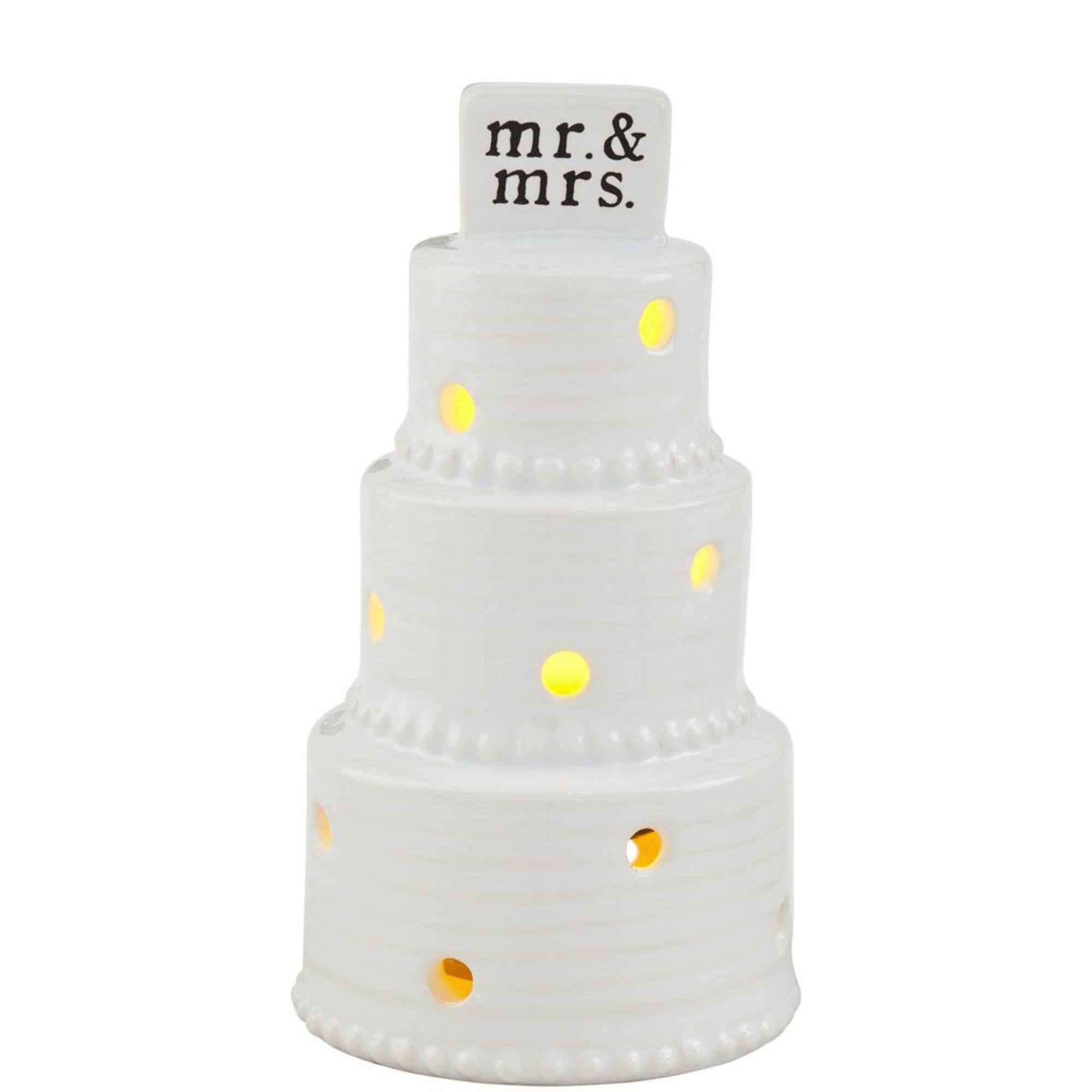 Complete your special day with this beautiful Wedding Cake Light Up & Sound Sitter by Mudpie. The ceramic sitter features an LED light-up interior and singing sound chip — perfect for setting the mood and capturing memories. Batteries included.