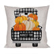 This interchangeable pillow cover comes with two designs. The front features two sunflowers with berries, while the back has a checkered pattern in white, orange and green. Perfect for fall decorating.