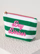 - Features a bright green color with the design of a pickleball and two paddles embroidered in navy, pink, and white