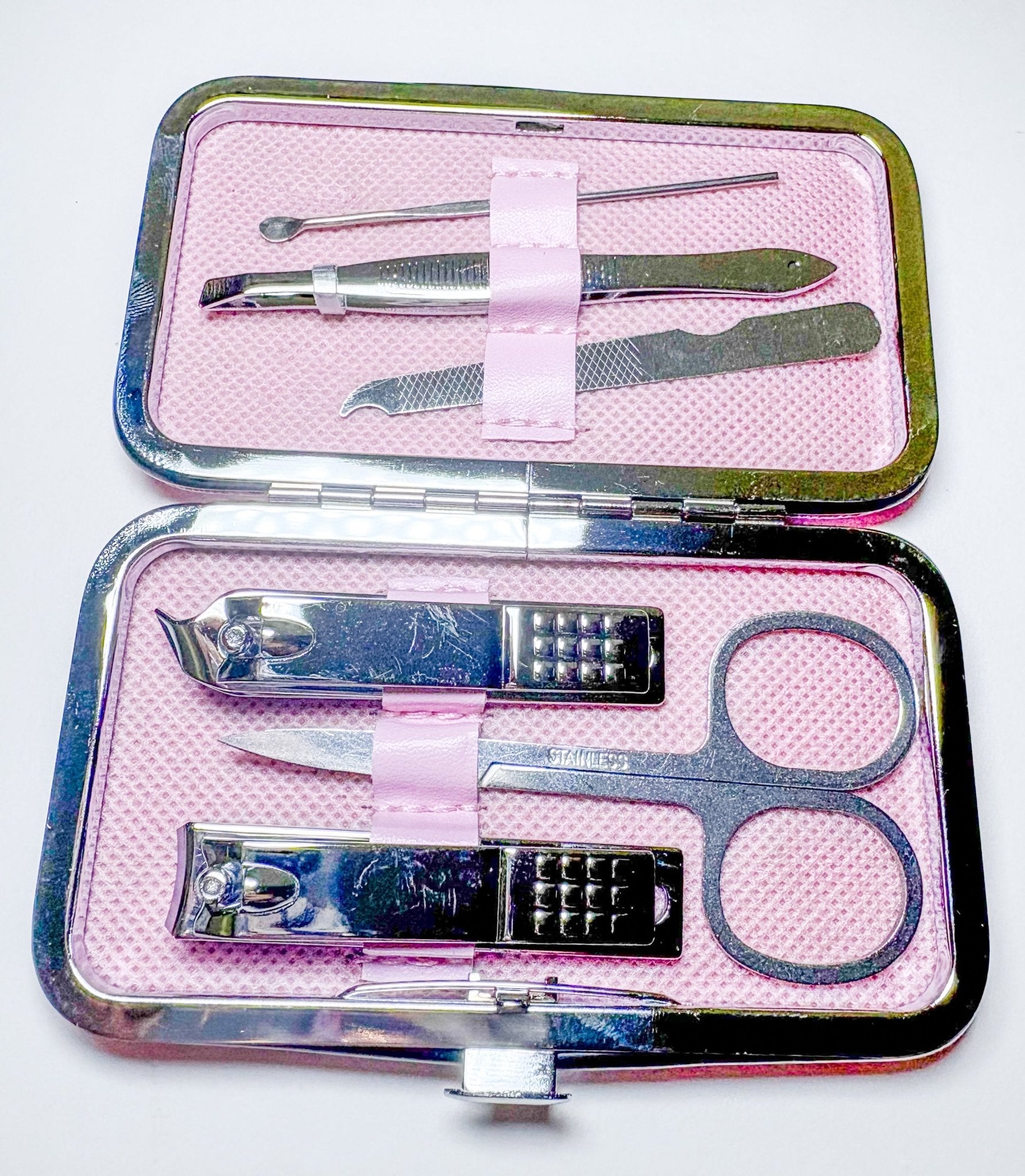 Includes 7 stainless steel tools: Nail clippers, cuticle scissors, tweezers, nail file, and more.