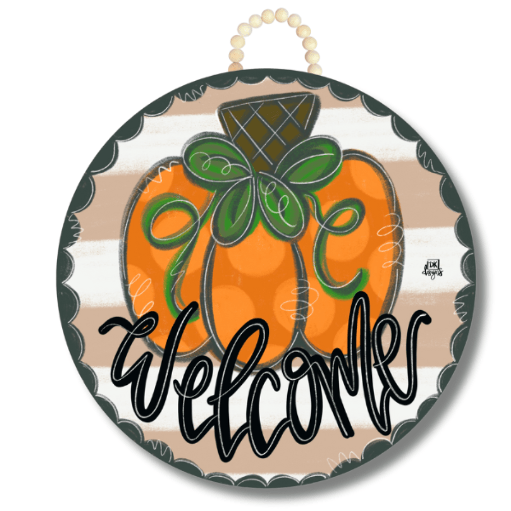 The Welcome Tan Pumpkin Circle Door Hanger is a UV Printed Door hanger measuring 23" tall that is perfect for indoor or outdoor use. All original designs are printed on a moisture resistant high quality 1/4" board and sealed for additional protection with 2 coats of a gloss finish. DK hangers come with a fully wired beaded handle. All products are designed, and manufactured in Forsyth, Georgia.