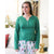 A long sleeve emerland green shirt with a slight v neckline. There are three white buttons at the neck.