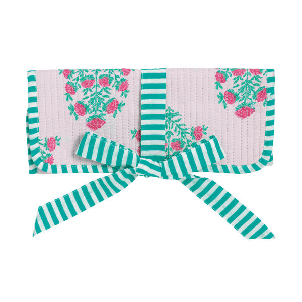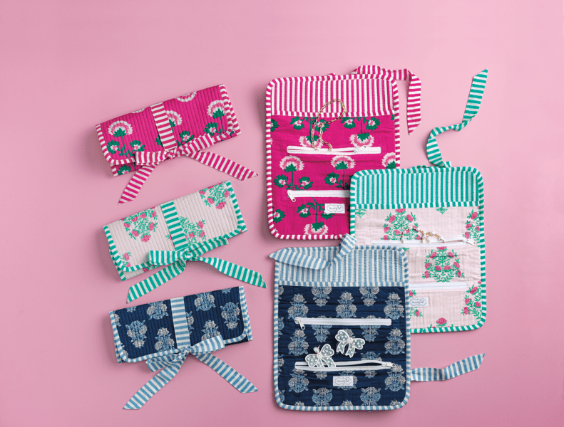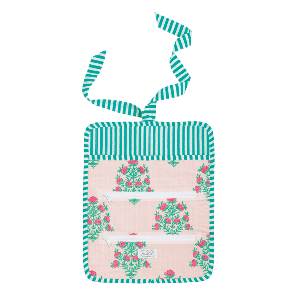 The Block Print Jewelry Rolls by Mud Pie is a stylish accessory designed for the modern traveler. Crafted from quilted cotton voile, this jewelry roll ensures your accessories are stored securely while on the go.