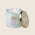 Up to 40 hours of burn time; White wax; 6 oz; textured glass with printed metal lid; 3” D x 3.25” H; Not tested on animals