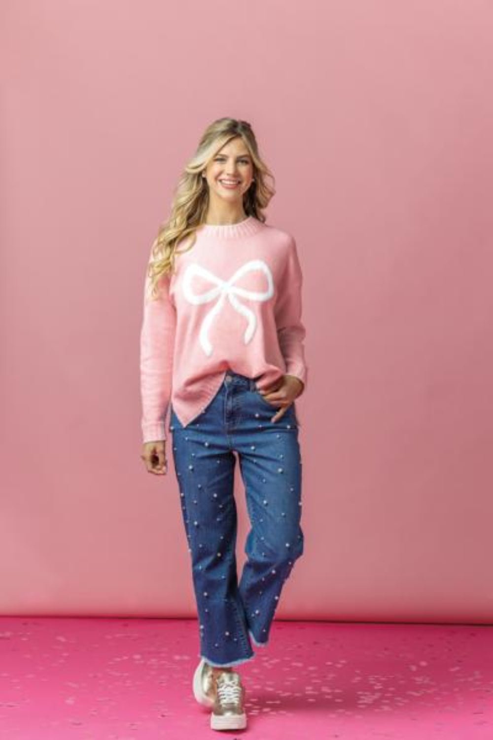 The Wilder Bow Sweater is crafted from a luxurious heathered wool blend, offering both style and comfort. This sweater showcases a distinctive jacquard icon, adding a touch of elegance to your wardrobe. The contrast stitching at the ribbed neckline, sleeve openings, and hem provides a refined finish, enhancing its overall appeal. With a length of approximately 24 1/2" from shoulder to hem on a size small, it offers a flattering fit for various body types. Available in three sizes (S, M, L), this sweater is made from a high-quality blend of 85% Polyester, 6% Acrylic, 5% Wool, and 4% Spandex, ensuring durability and a comfortable stretch. Perfect for layering or wearing on its own, the Wilder Bow Sweater is a versatile addition to any fashion-forward wardrobe.
